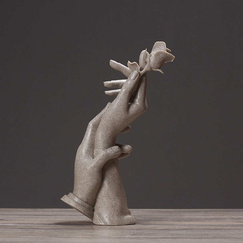 • Resin sculpture of embracing hands holding a rose